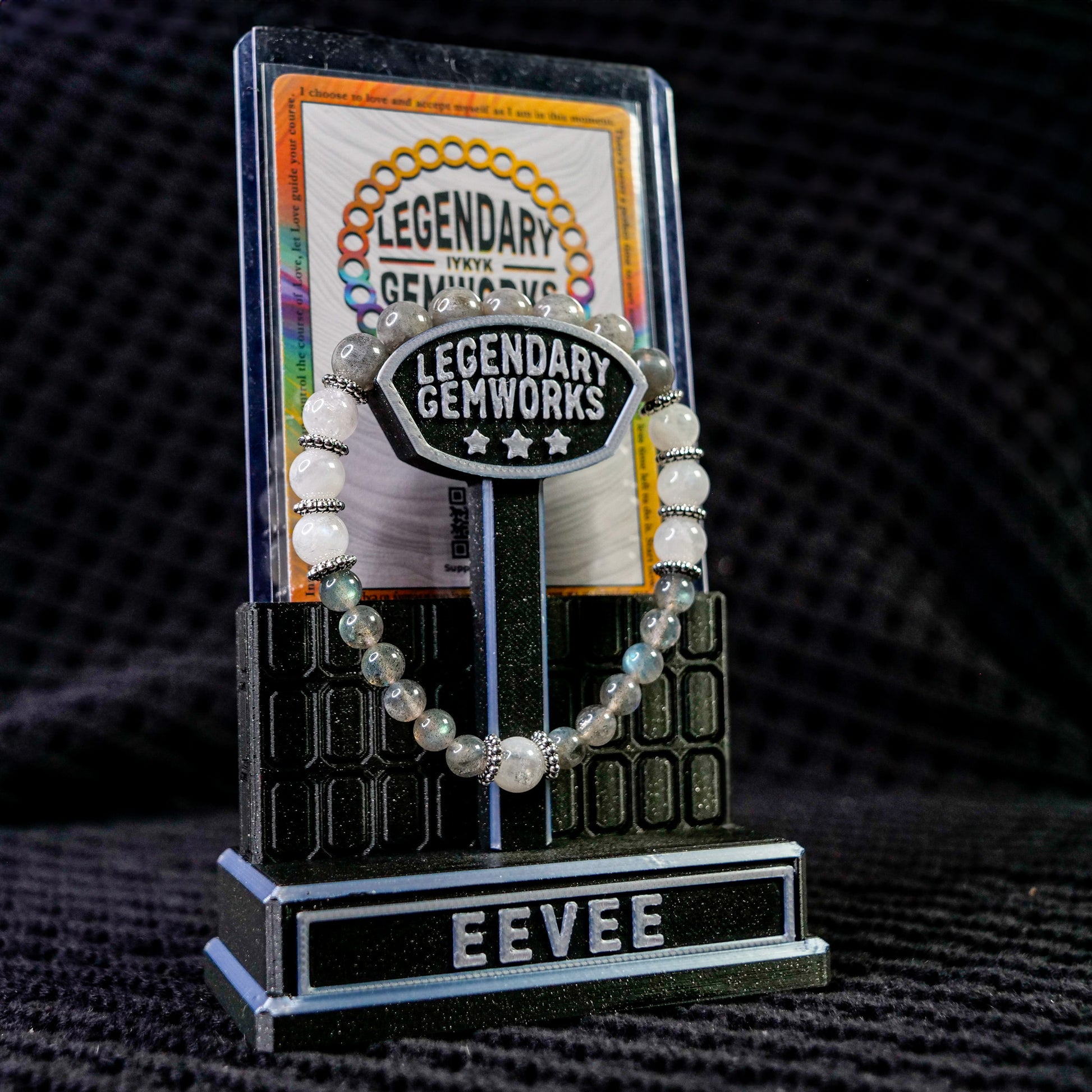 Built with A+ Madagascar Labradorite and AAA+ Rainbow Moonstone, this piece feels alive in the light. The labradorite flashes with hidden blues, greens, and golds as it moves, like power quietly waiting to be unlocked. It perfectly captures what Eevee represents to so many of us — potential, adaptability, and contained strength.