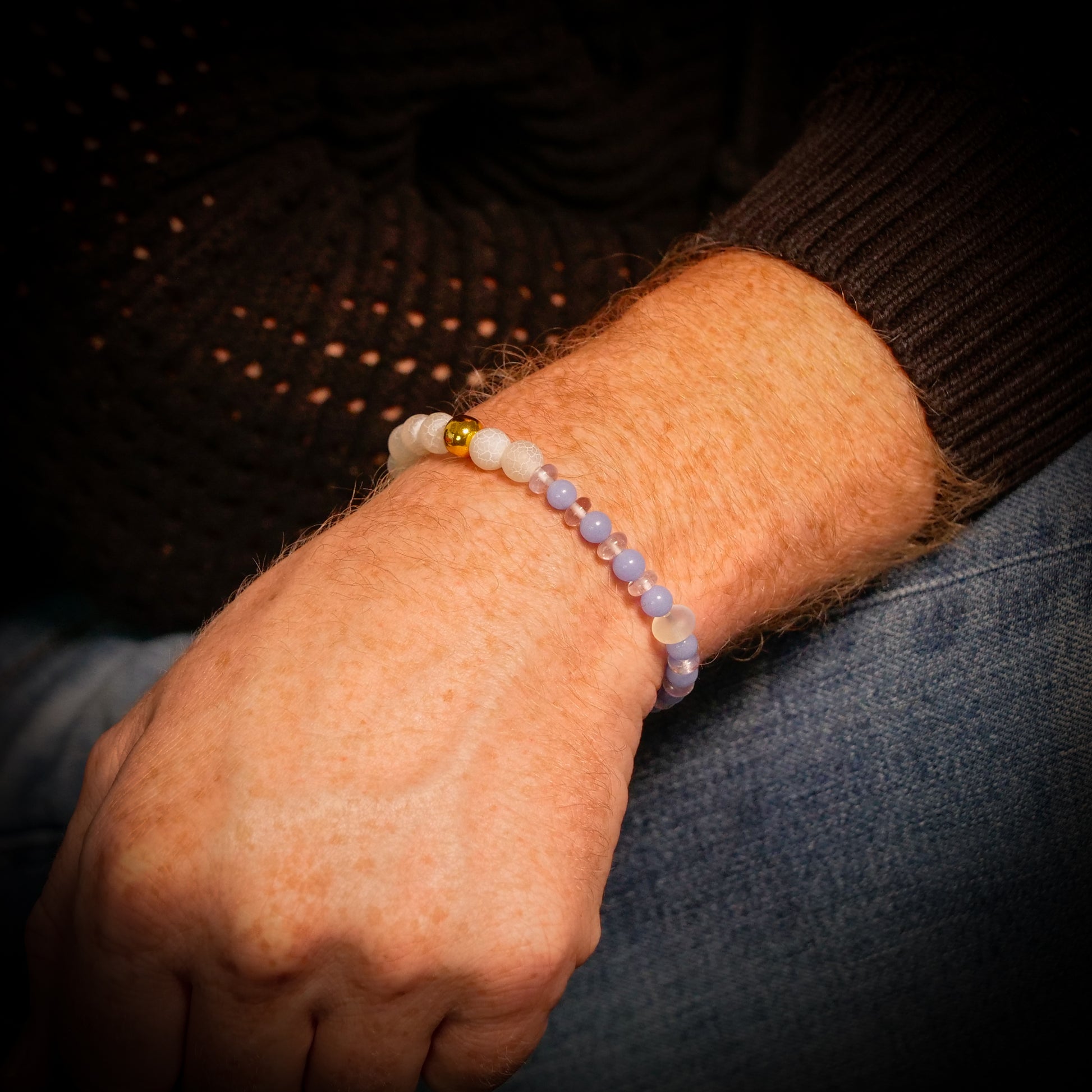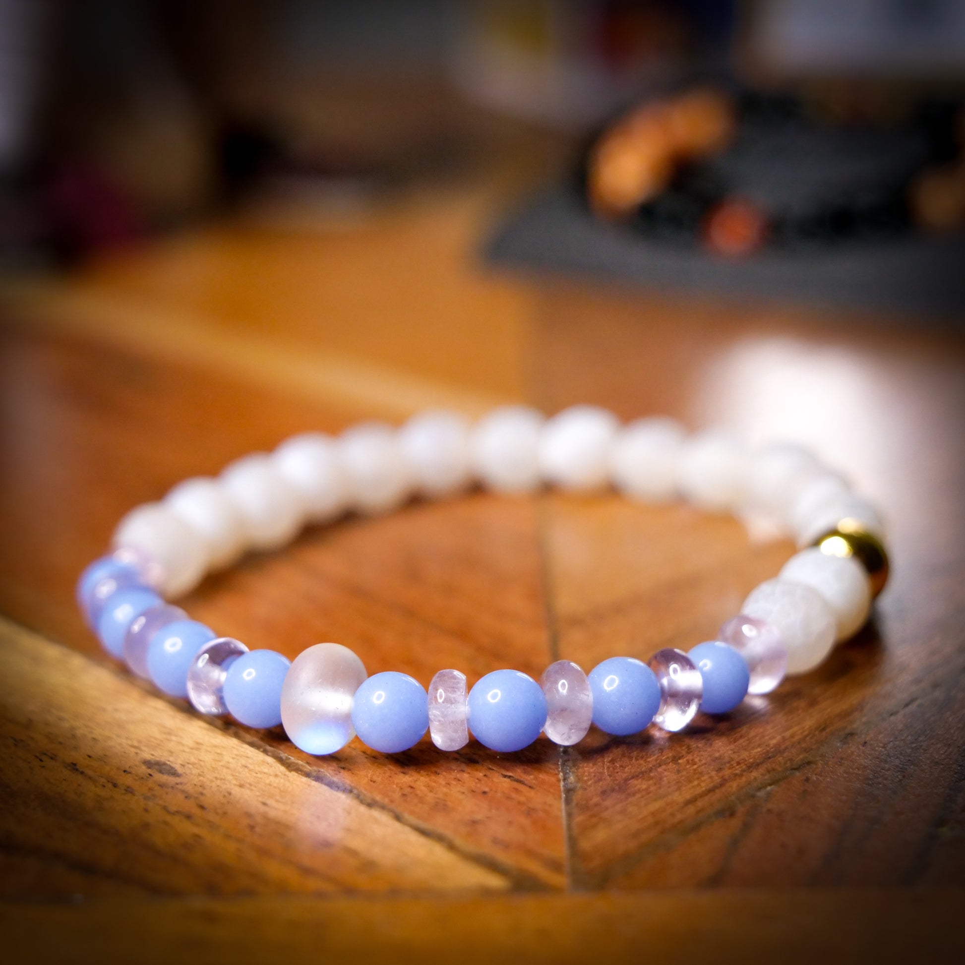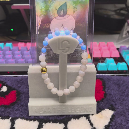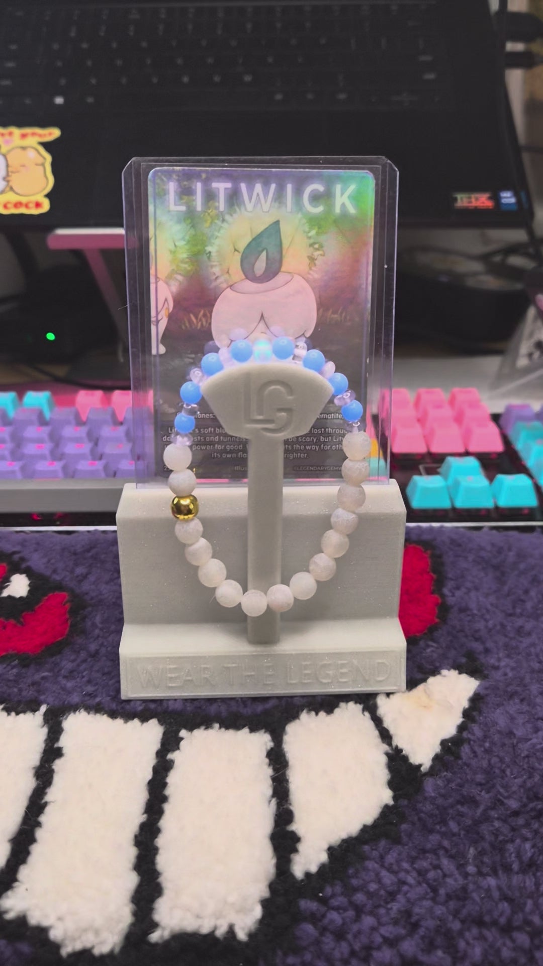 This hauntingly beautiful bracelet captures Litwick’s gentle glow and guiding flame. Made with Dragon Vein Agate, Amethyst, Blue Luminous Stone, Hematite, and a single Hologram Quartz bead that shimmers with ghostly blue light, this design glows softly like a candle in the dark.
