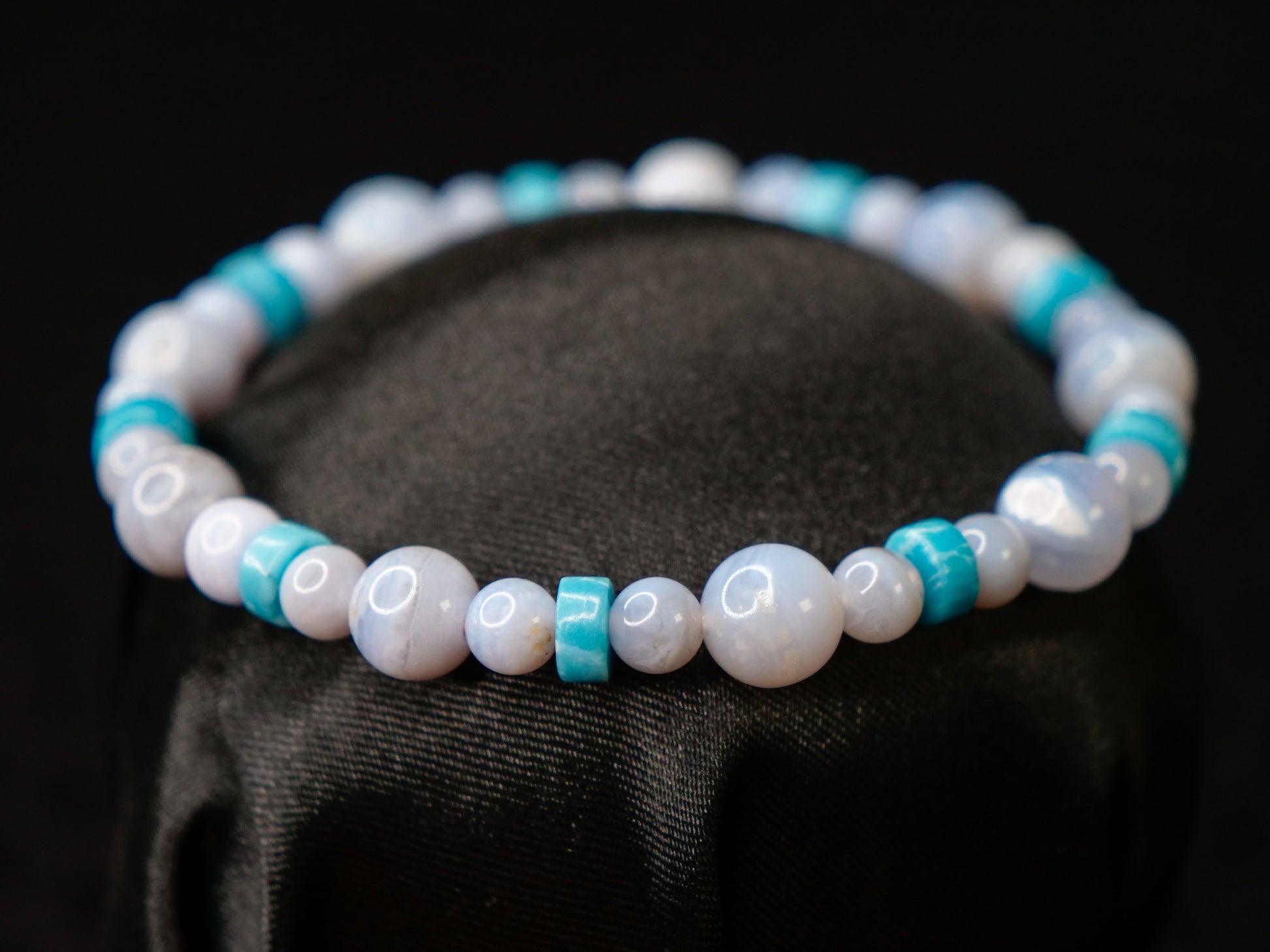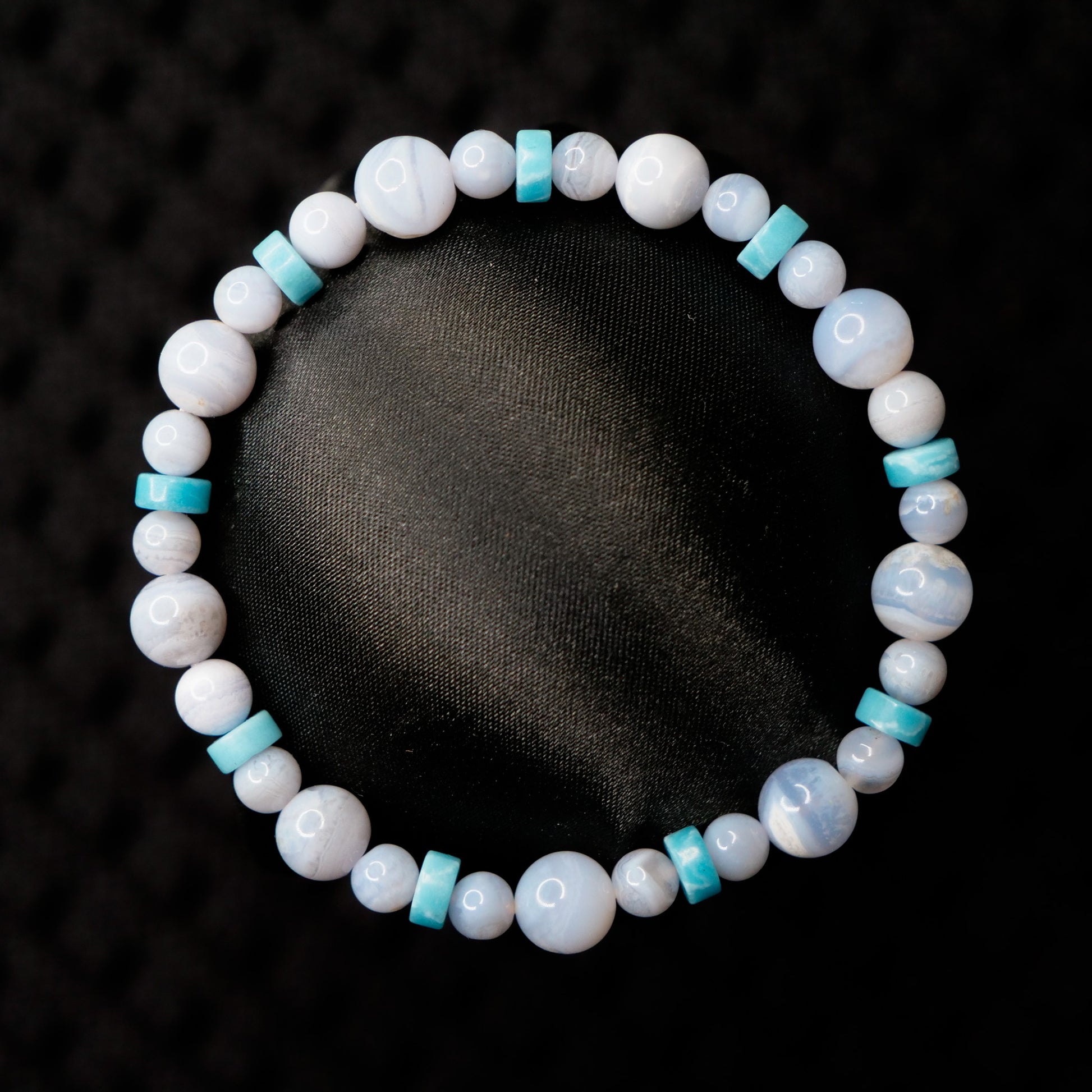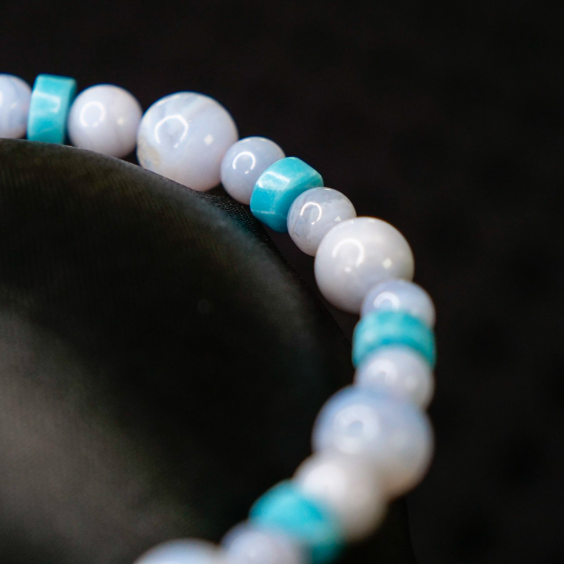 This design reflects that energy. The Blue Lace Agate gives the piece its dreamlike softness, while the Larimar spacers add balance and depth, like ripples moving through still water. It’s a bracelet meant for those who appreciate subtlety, lore, and rarity over flash.