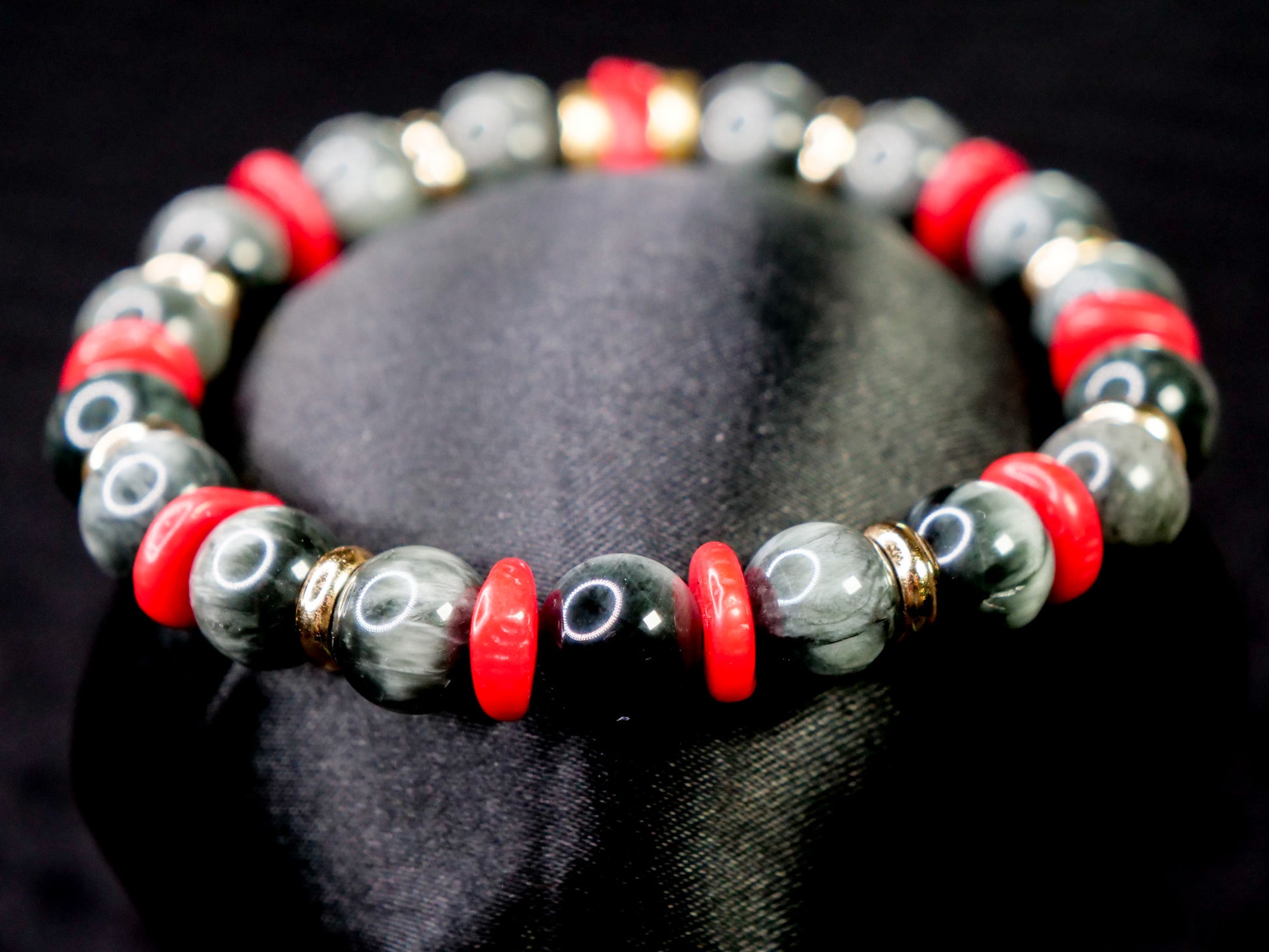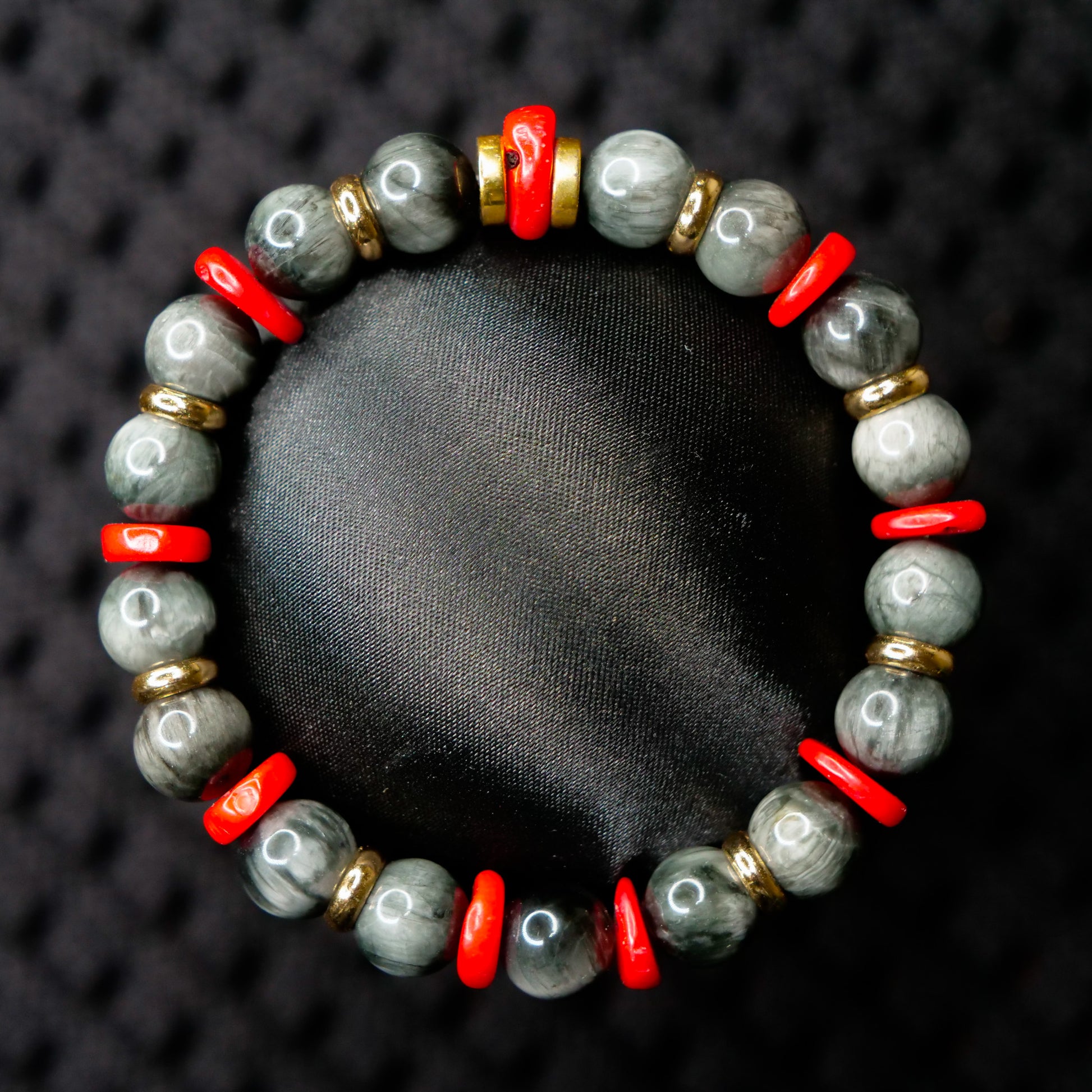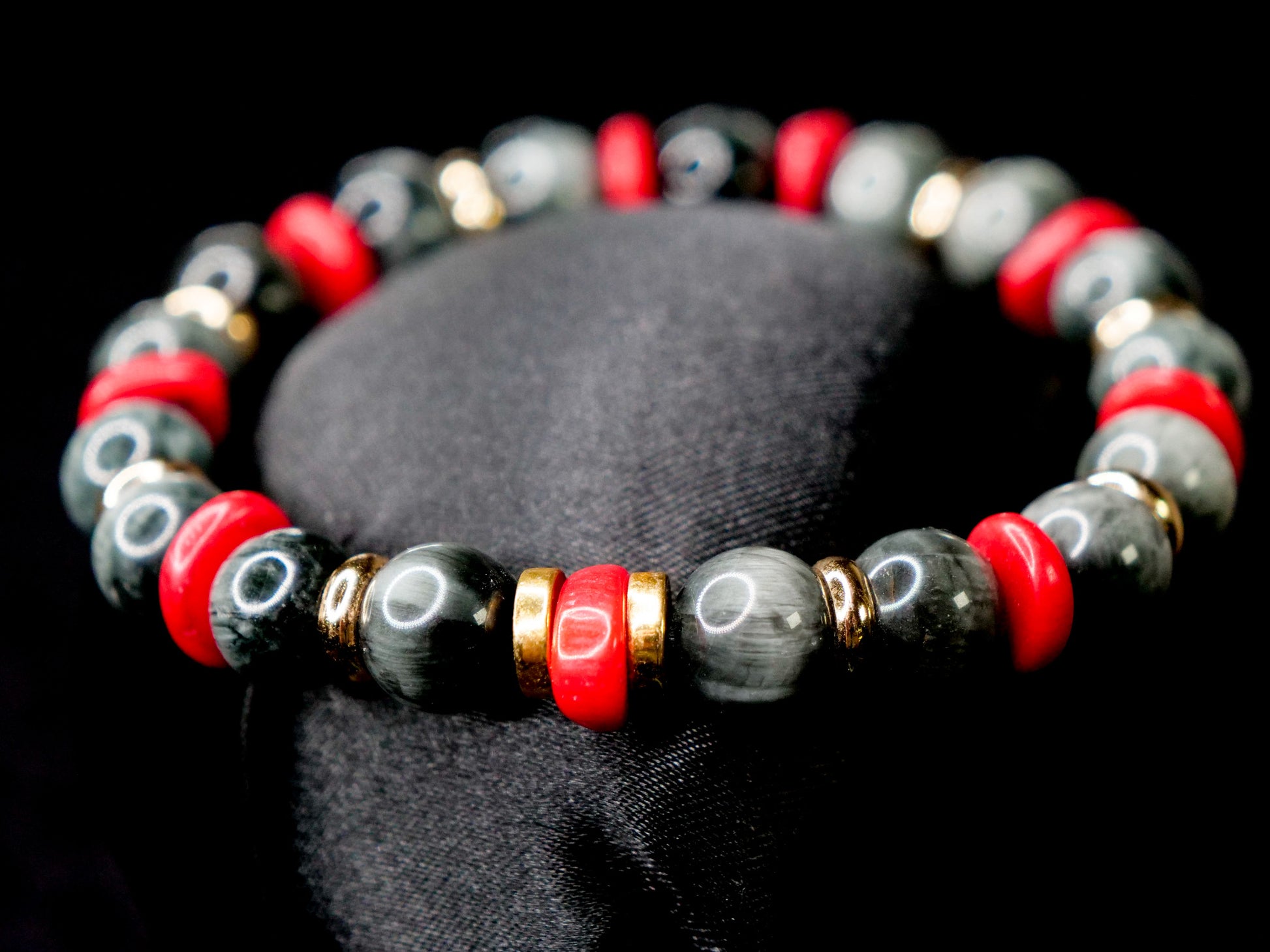 This bracelet leans into that idea—contained power, quiet vigilance, and the moment when restraint gives way to action. The contrast between muted grey Eagle Eye and striking red coral reflects that tension, while the overall balance keeps the piece grounded and wearable.